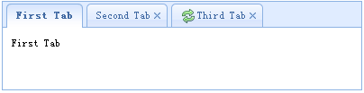 <div class="easyui-tabs" style="width:400px;height:100px;"> <div title="First Tab" style="padding:10px;"> First Tab </div> <div title="Second Tab" closable="true" style="padding:10px;"> Second Tab </div> <div title="Third Tab" iconCls="icon-reload" closable="true" style="padding:10px;"> Third Tab </div> </div>
